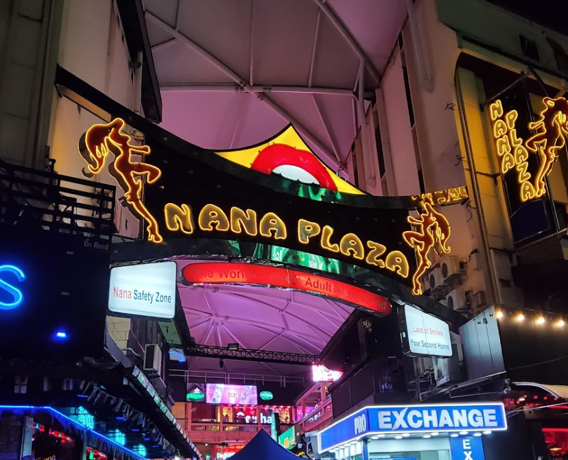 수쿰빗 소이 4에 있는 나나 플라자 입구에는 크게 나나 플라자라고 적힌 간판이 있습니다. 이곳은 거리가 아닌 3층짜리 건물이며, 이곳은 방콕에서 가장 인기 있는 술집 거리 중 하나입니다.