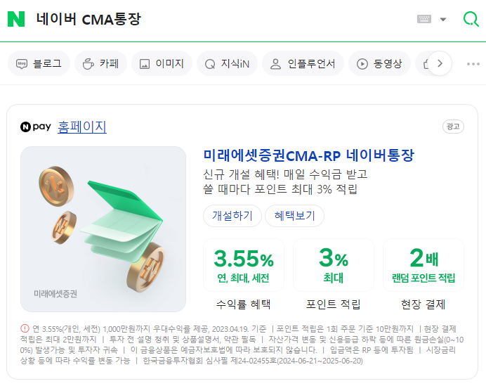 네이버 CMA통장은 미래에셋증권과 합작하여 만든 통장으로