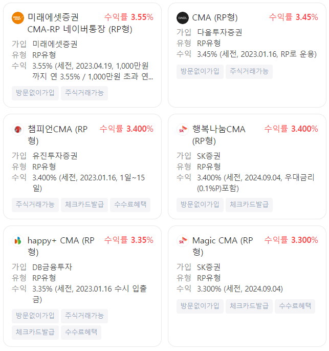 네이버에서 검색 시 CMA 통장 금리는 평균 3%대를 보여줍니다.